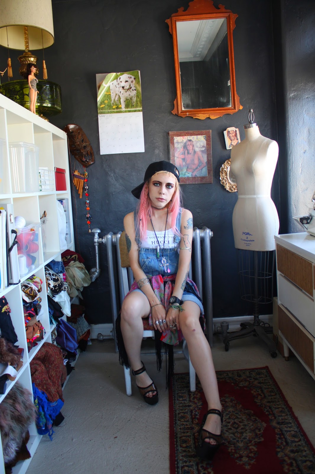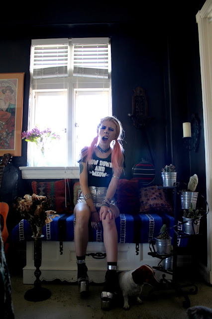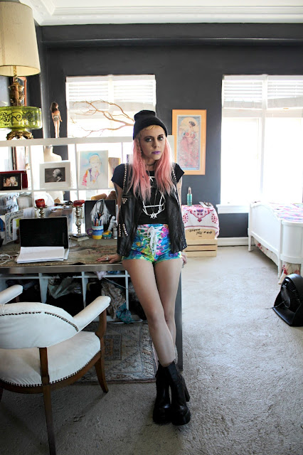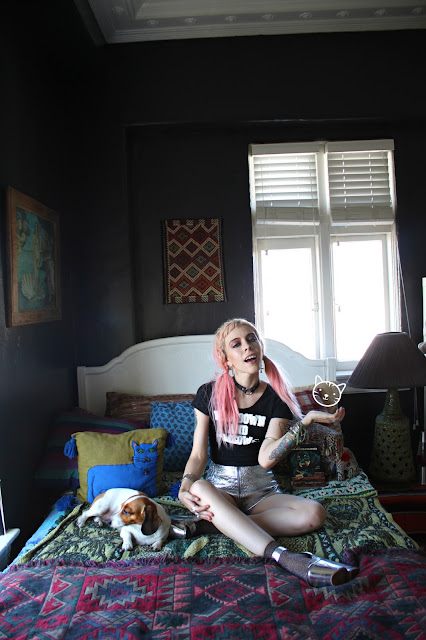We cant handle how cool Madeline P. of Jean Greige and Tunnel Vision is! Her apartment is a perfect reflection of her personality and taste, so we had to shoot there. Not only is she an amazing person, but she blogs, owns a store with Brit D., and their own label Bad Vibes (the shorts she's wearing with Bow Down & the Enneagram T are both by her)!
