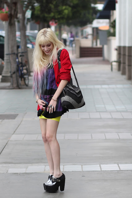 UO red blazer, Yellow NIN3 neon tube skirt, Jeffrey Campbell Warnings
