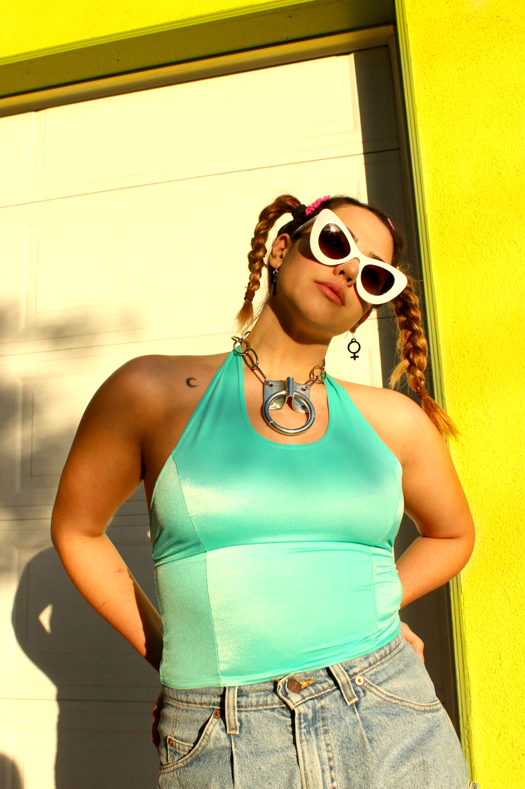 ♀ Maddie O. is wearing the Girl Power earrings in black and Divisible By None choker and head to toe vintage by Tunnel Vision ♀